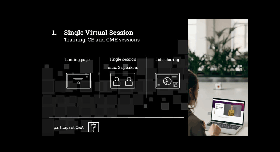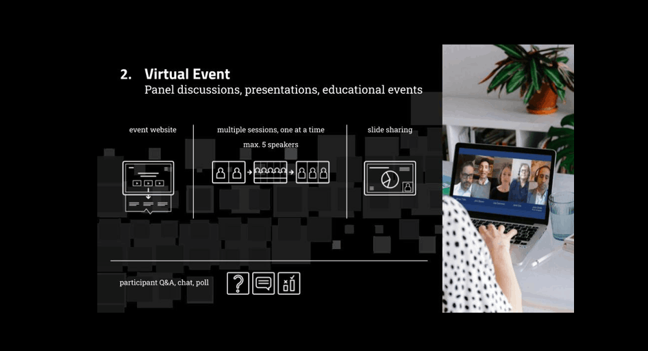 Panel discussions, presentations, education events: website, max. 5 speakers, multi sessions, slide sharing, Q&A, chat, poll