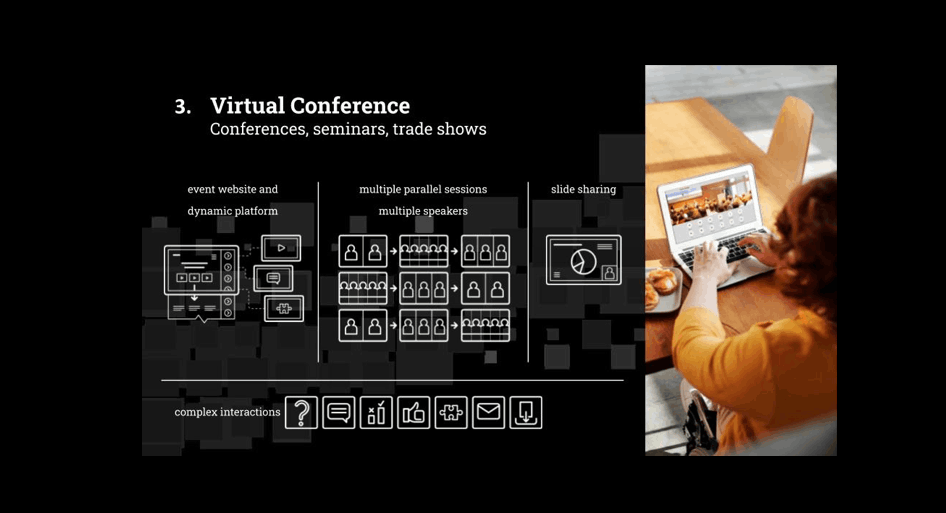 Conferences, seminars, trade shows: event web portal and dynamic platform (mobile reponsive), multiple speakers, parallel sessions, complex interactions, poll, survey, chat, Q&A, interpreter, trade show room